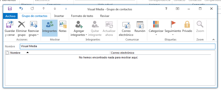 Aqui podremos ver los correos añadidos y procederemos a dar clic en el botón Guardar y cerrar. En nuestro ejemplo puede ver que el grupo Visual Media, ya esta creado.
