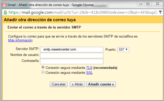 En «Servidor SMTP» ponemos a nuestro servidor entrante, en mi caso «mail.viawebcenter.com».